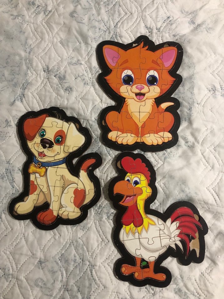 Kedi, köpek ve horoz figürlü, çocuklar için renkli puzzle seti. Tanesi 50 tl