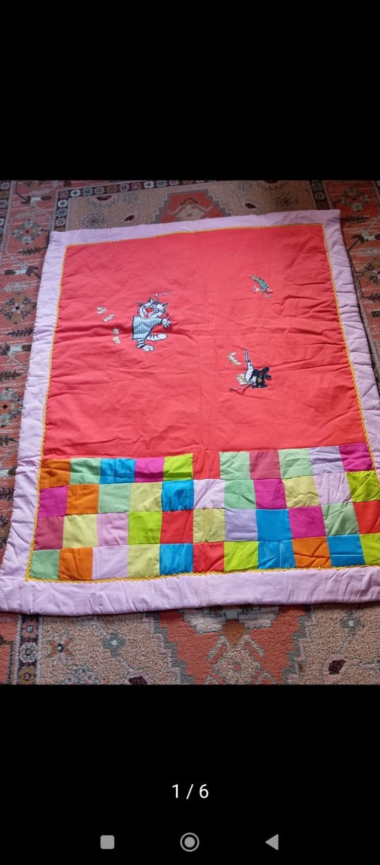 Renkli işlemeli hayvan desenleri ve patchwork desenli, yumuşak tekstil kumaştan yazlık çocuk yorganı kırk yama içi elyaf sıfır üründür 1 metre 20 cm boyu eni 1 metredir
