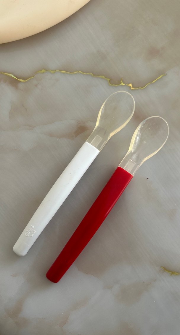 Wee baby.Çocuklar veya bebekler için silikon yumuşak saplı, biri kırmızı diğeri beyaz iki renkli kaşık seti. Hiç kullanılmadı