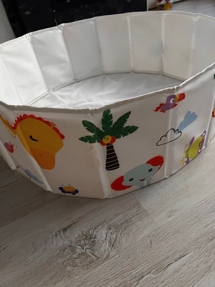 Renkli hayvan ve doğa desenleriyle beyaz zemin üzerinde katlanabilir, yumuşak ve suya dayanıklı çocuk havuzu.