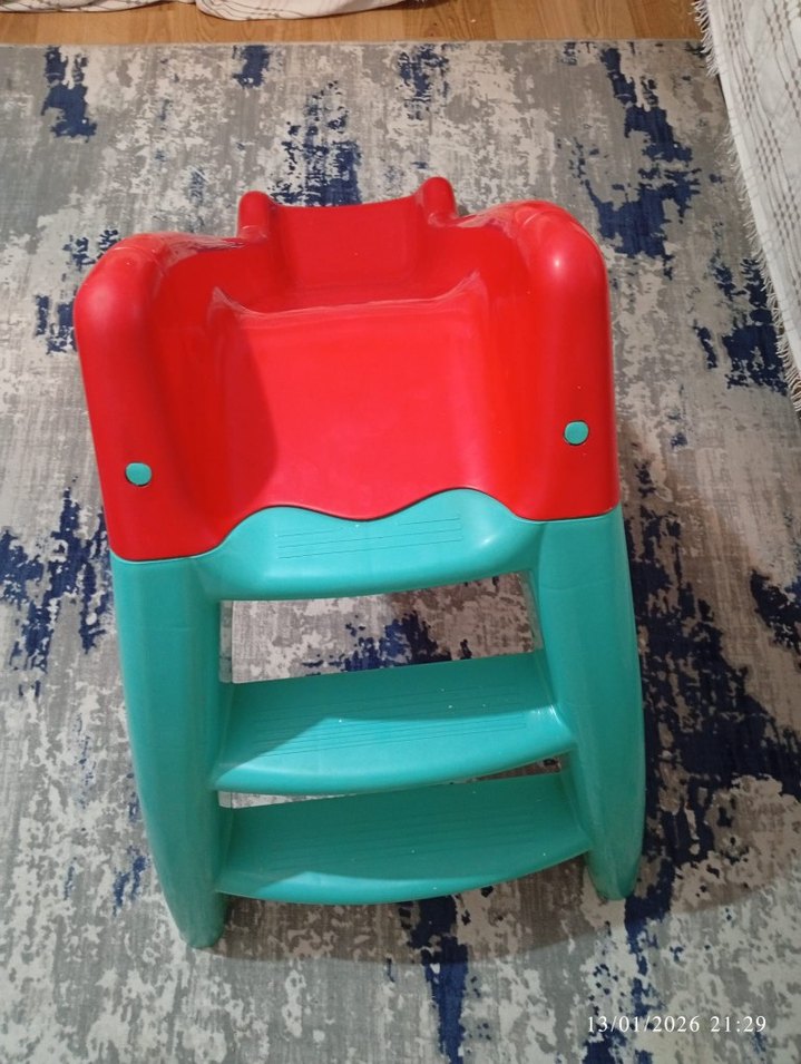 Çocuklar için kırmızı oturaklı, yeşil basamaklı renkli plastik kaydırak. Güvenli ve eğlenceli oyun sağlar.