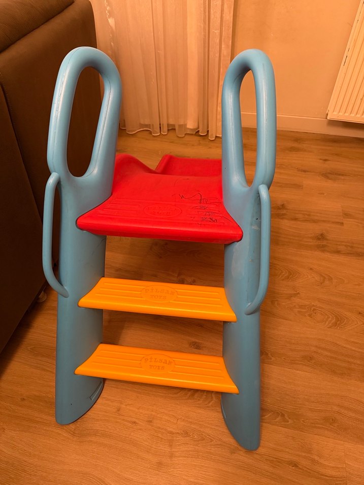 Mavi yanları, turuncu basamakları ve kırmızı kaydırak yüzeyi olan renkli çocuk oyun eşyası. Güvenli ve eğlenceli oyun için yumuşak tutma kolları bulunur.