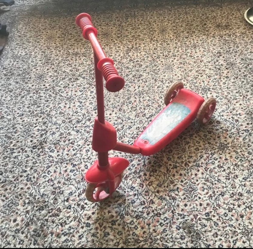 Üç tekerlekli, sağlam yapılı renkli kırmızı çocuk scooterı. Rahat tutacaklar ve geniş ayaklık ile dengeli sürüş sağlar.