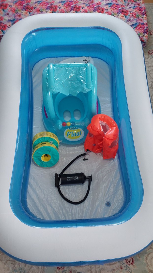 Renkli mavi şişme havuz seti, tente kapaklı bebek simidi, kol yüzgeçleri, şişme halkalar ve pompa içerir. Çocukların suda güvenle eğlenmesi için uygundur. ️