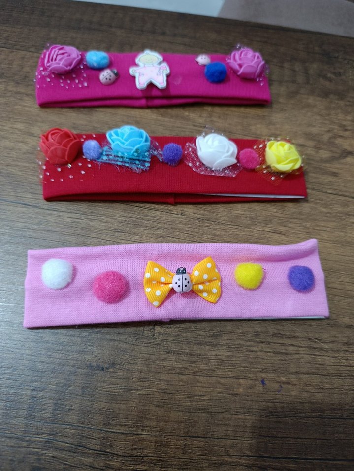 Çocuklar için renkli, lastikli saç bantları; nakışlı detaylar ve ponpon, fiyonk gibi süslemeler içerir. Canlı ve eğlenceli bir tarz sunar. 3 adettir