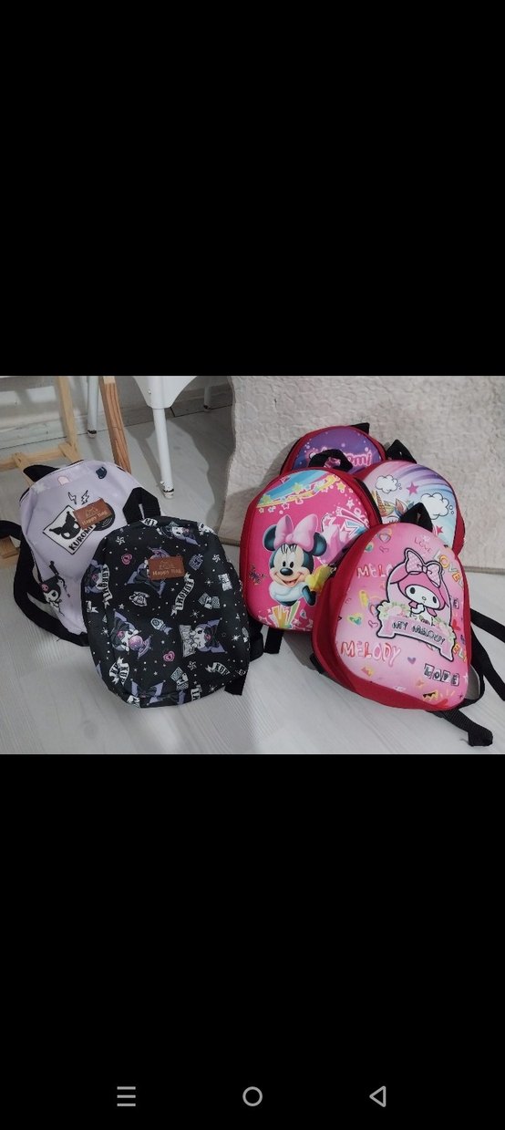 Popüler çizgi film karakterleri ve çeşitli desenlerle çocuklar için renkli okul çantaları.