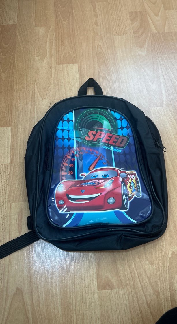 Renkli araba desenli çocuk okul çantası. Ana bölmesi ve ayarlanabilir askıları vardır.