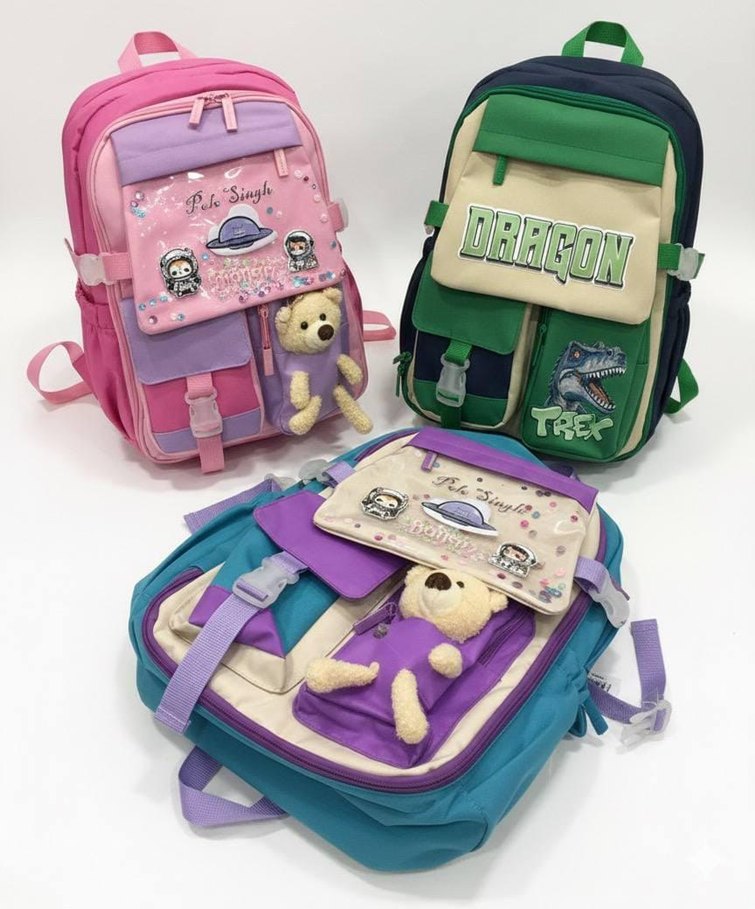 Çok bölmeli pastel renkli çocuk okul çantaları, sevimli ayıcık aksesuarları ve "TRE" ile "DRAGON" baskıları içerir. istenilen renk ve model ilan açılarak satın alınabilir 1 hafta gecikmeli olacaktır bilginiz olsun