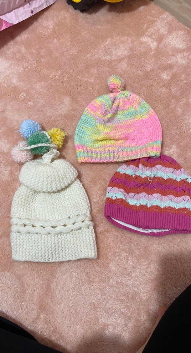 Üç adet pastel ve çok renkli örgü bereden oluşan set. Yumuşak örme kumaştan, bohem tarzda, ponpon ve çizgili modeller içerir. Sadece renki olanın ponponu hafif gevşemiş o kadar