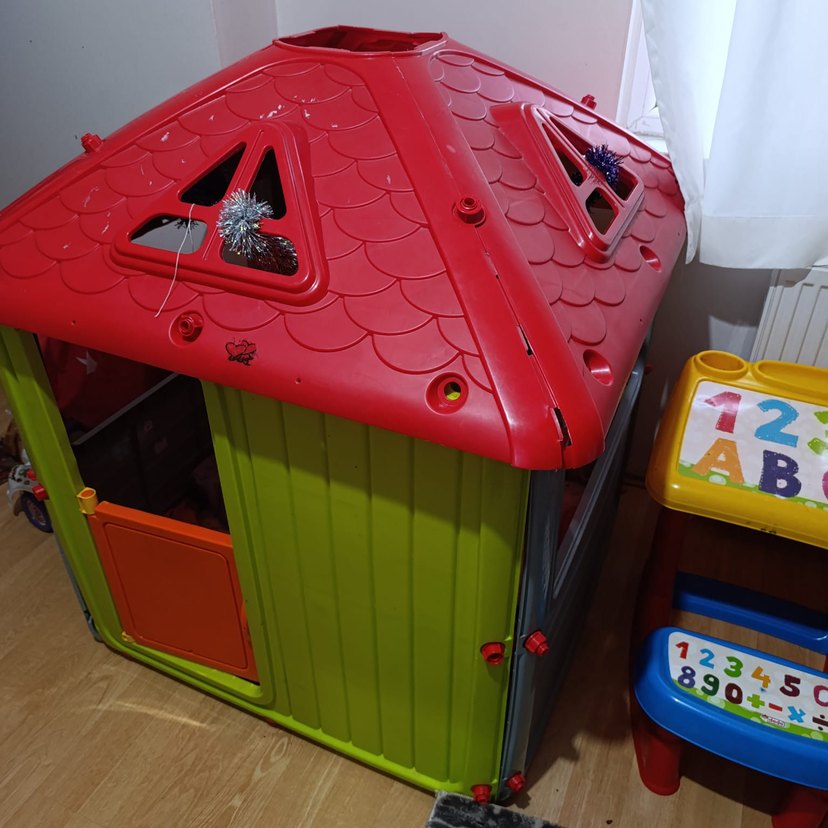 Kırmızı çatılı ve yeşil duvarlı, çocuklar için renkli oyun evi. İç mekan kullanımı için uygun, pencere ve kapı açıklıkları bulunur.Bazı ufak parçaları eksiktir.