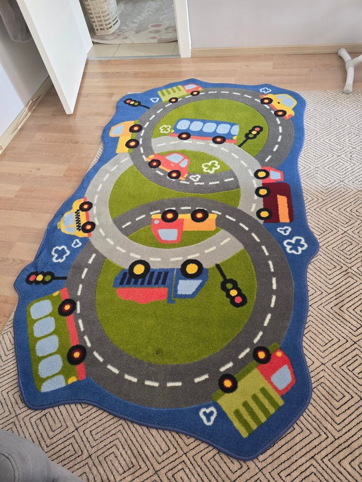Renkli çocuk halısı, yumuşak dokusu ve oyun yolları ile araç desenleri içerir. ️ufak nokta kadar defosu var