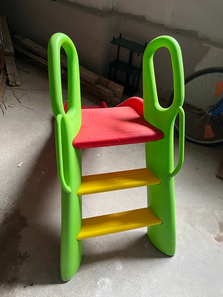 Kırmızı oturaklı, sarı basamaklı ve yeşil tutamaklı renkli çocuk oyun merdiveni, güvenli ve eğlenceli tırmanma sağlar.