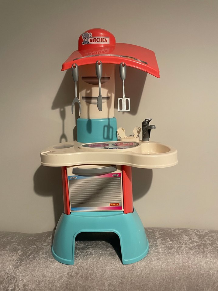 Kırmızı tente, askılı mutfak gereçleri ve açık mavi tabanlı canlı renklerde çocuk oyun mutfağıdır. Musluk, ocak ve fırın içerir. Yeni gibidir. Kutudan cıkartık ama kullanılmadı