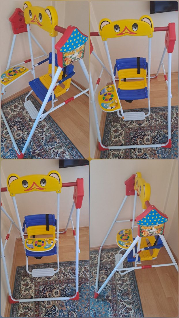 Dayanıklı iskeletli, güvenlikli oturma yeri ve etkileşimli parçaları olan renkli çocuk salıncağıdır.
