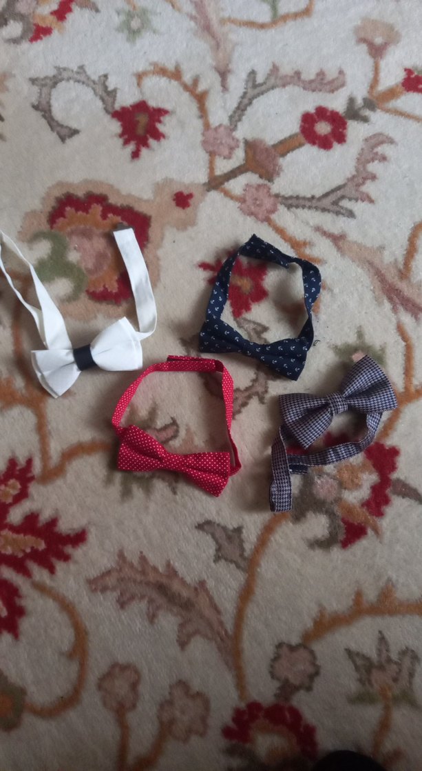 Sentetik kumaştan, beyaz, kırmızı, mavi ve mor renklerde dört adet koyu ve canlı renkte çocuk papyonu seti.