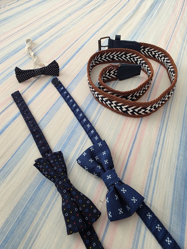 Sentetik kumaştan yapılmış, mavi desenli renkli papyon ve kravat seti. . Resimlerde görüldüğü gibi..