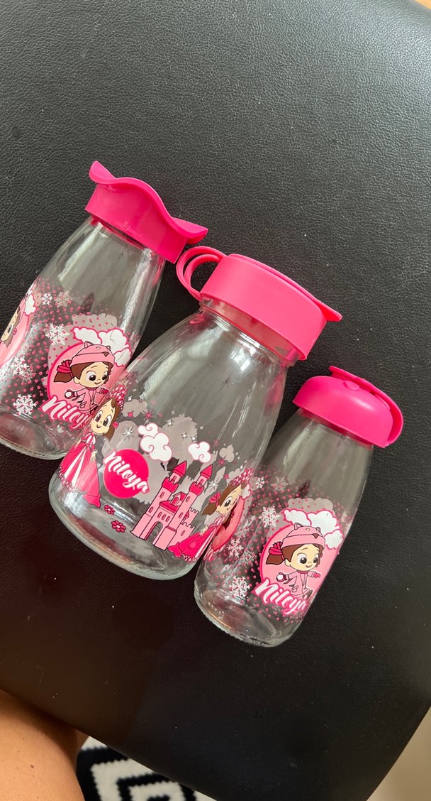Çocuklar için renkli pembe termos şişeler, eğlenceli çizgi film desenleri ve taşıması kolay kapaklarla tasarlandı.