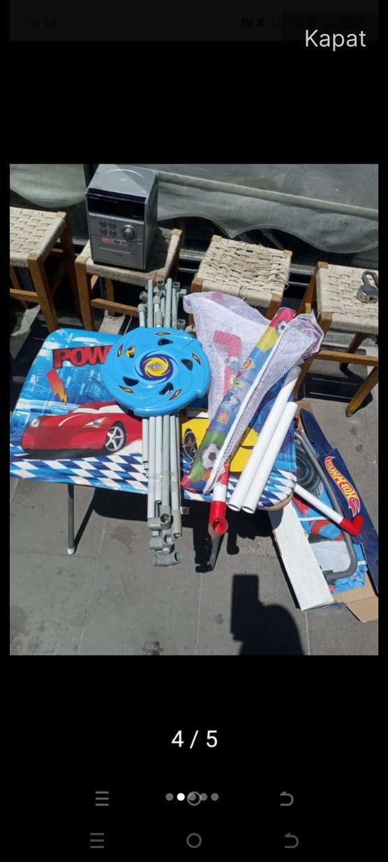 Mavi renkli araba desenli çocuk plaj sandalyesi, katlanabilir çerçeve ve çeşitli ağlar ile toplardan oluşan renkli havuz seti.