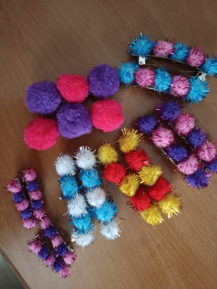 Renkli ponponlar ve püskül detaylarıyla çocuklar için saç tokaları, canlı ve neşeli bir görünüm sunar.