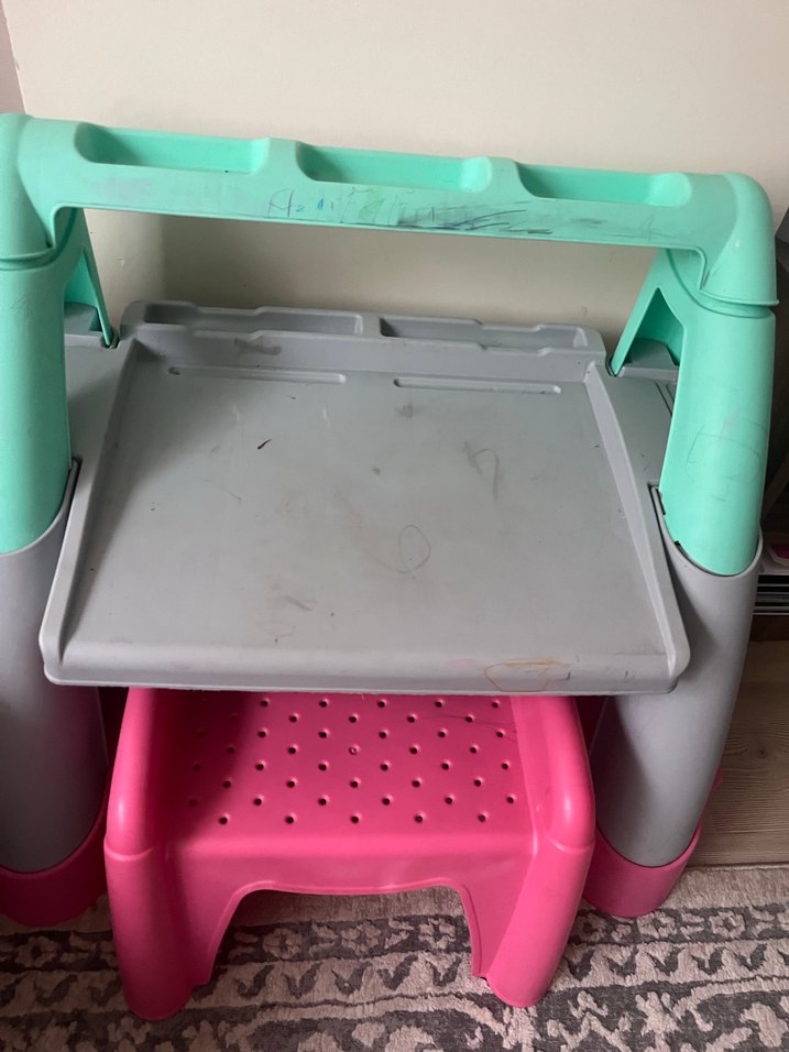 Gri ve pembe plastik parçalardan oluşan, delikli pembe tabure ve gri masa üstü ile renkli çocuk rafı ve masa seti.
