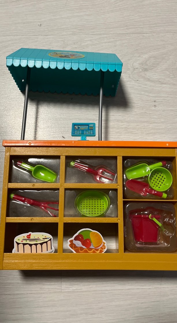 Renkli çocuk rafı, oyuncak mutfak gereçleri, tente ve küçük terazi ile hayal gücünü destekler. ️