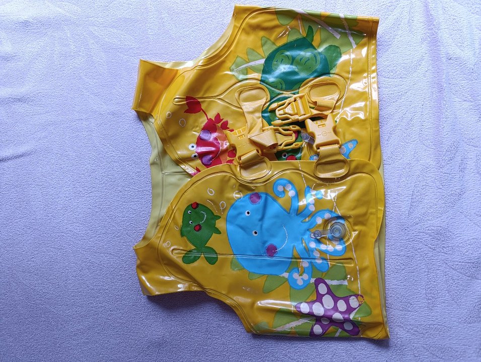 Çocuklar için deniz canlıları desenli, renkli sarı can yeleği, havuz için uygun.