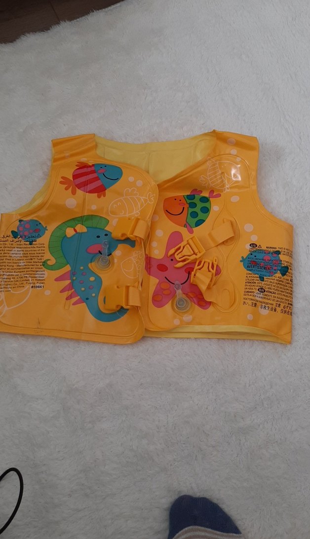 Ayarlanabilir kayışlara sahip, çocuklar için renkli sarı can yeleği, eğlenceli balık desenleriyle su aktivitelerinde güvenlik sağlar. intex marka.hic kullanılmadı