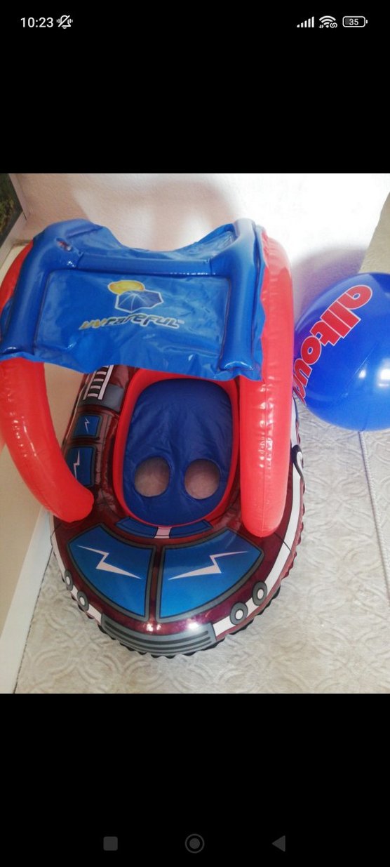 Mavi tente ve kırmızı detaylara sahip, çocuklar için renkli şişme deniz aracı. ️herhangi defosu yok 1kere kullandık oturaklı