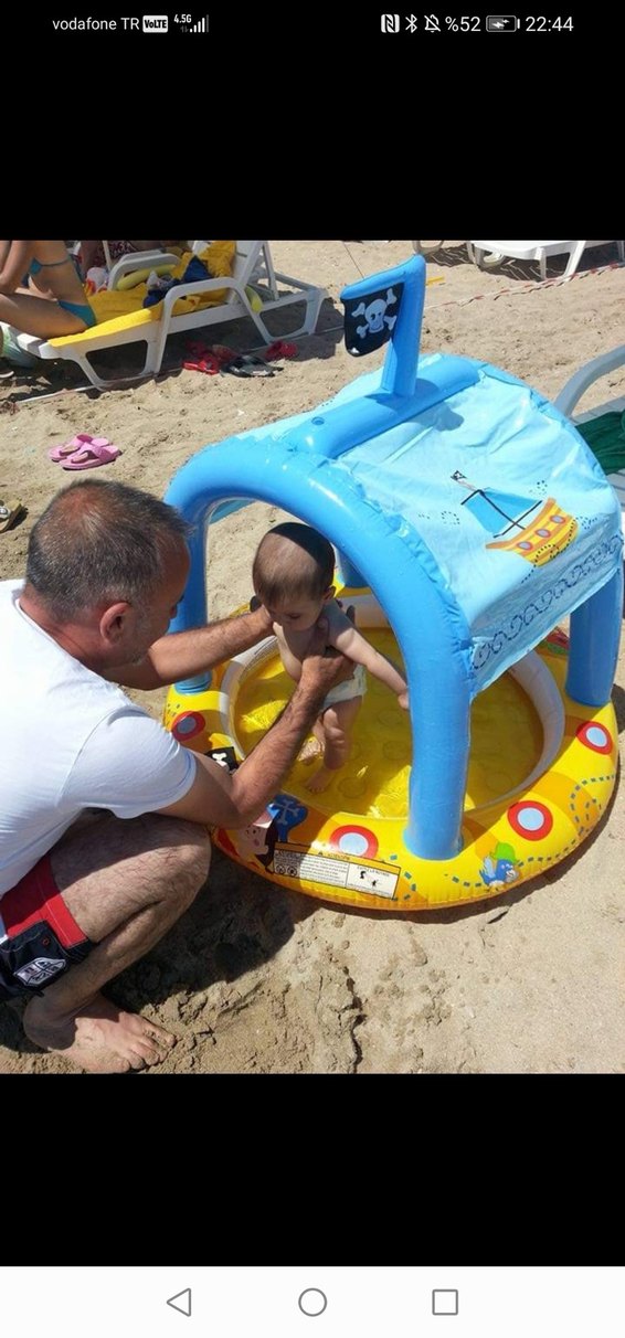 Renkli şişme çocuk havuzu, mavi güneşlik ve korsan bayrağı ile plajda gölge ve eğlence sağlar. ️