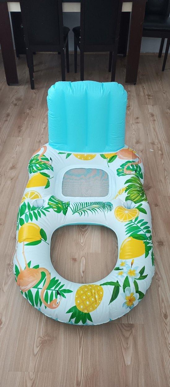 Mavi sırt dayanağı ve tropikal meyve desenleriyle çocuklar için renkli şişme havuz koltuğu. Rahat ve eğlenceli. ️