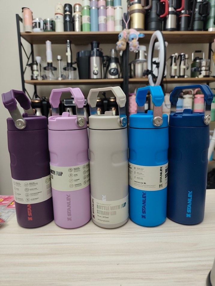 Çocuklar için renkli Stanley termos şişeleri, sağlam tutacaklı ve güvenli kapaklıdır. Mor ve mavi tonlarında mevcuttur.
