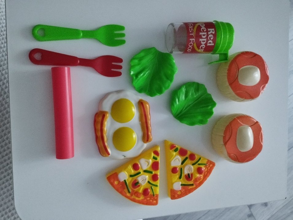 Çocuklar için renkli tabak, çatal ve bıçak seti. Pizza dilimleri, yumurta, pastırma ve marul oyuncakları ile birlikte 'Red Pepper Fast Food' yazılı oyuncak şişe içerir. ️