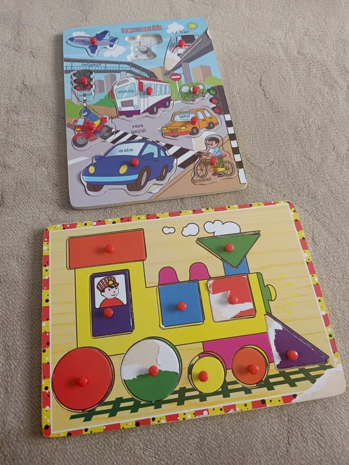 Renkli tahta puzzle seti, ulaşım temalı ve şekil eşleştirme tren puzzle'ından oluşur, çocukların motor becerilerini ve tanıma yeteneklerini geliştirir. 3 yaş altı içindir Yıpranma payı vardır Resimlerde görüldüğü gibi Eksik parçalar vardır