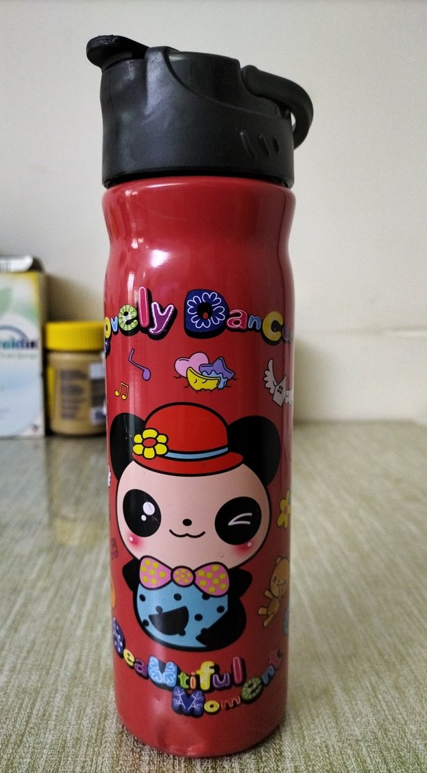 Renkli kırmızı termal su matarası, çocuklar için sevimli çizgi karakterli tasarıma sahip.
