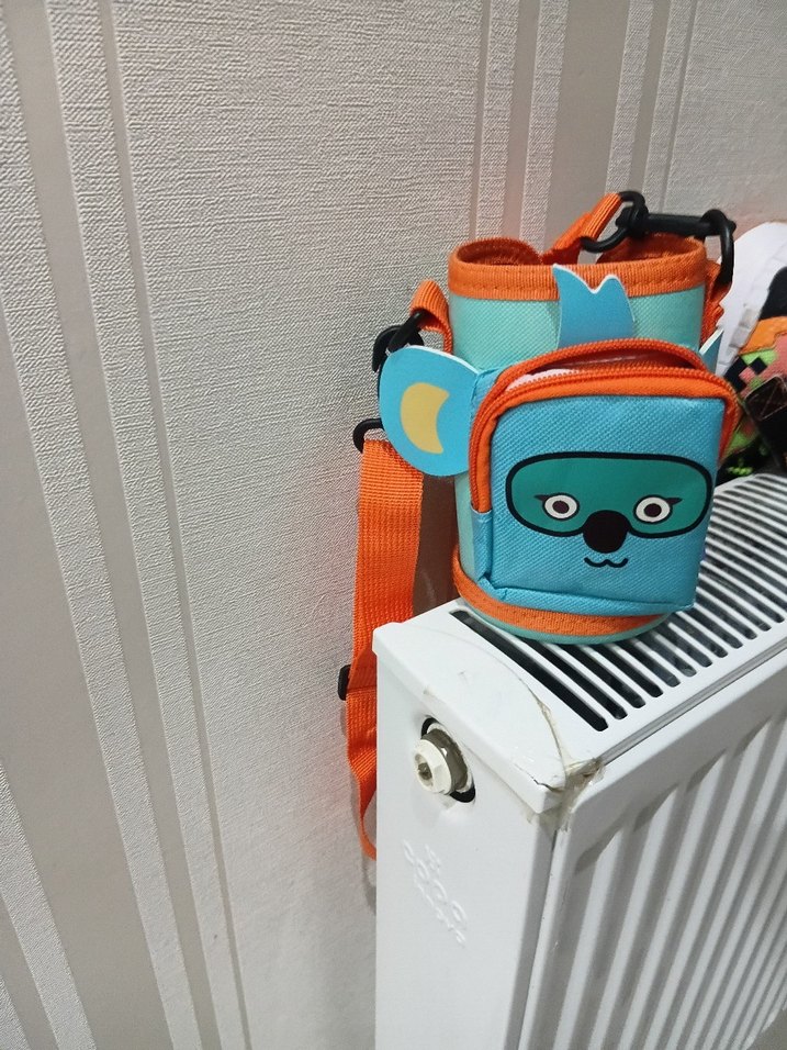 Hayvan yüzü tasarımlı, ayarlanabilir askılı çocuklar için renkli mavi termos çanta. İçecekleri sıcak tutar ve taşımayı kolaylaştırır.
