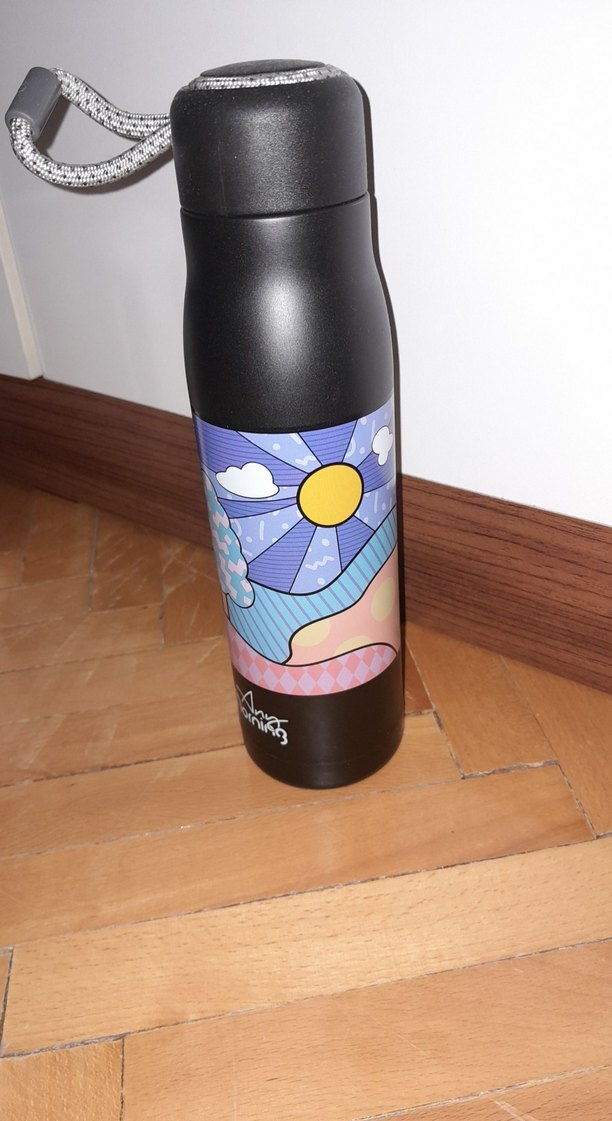 Çocuklar için tasarlanmış, koyu renk tabanlı ve güneş ile bulut desenli canlı renklerde termos şişe. İçecekleri sıcak veya soğuk tutar.