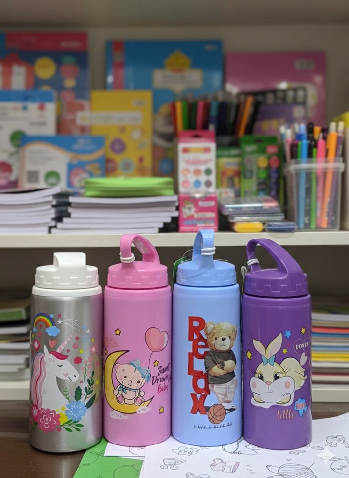 Çocuklar için renkli ve desenli termos şişeler. İçecekleri sıcak ya da soğuk tutmak için uygundur.
