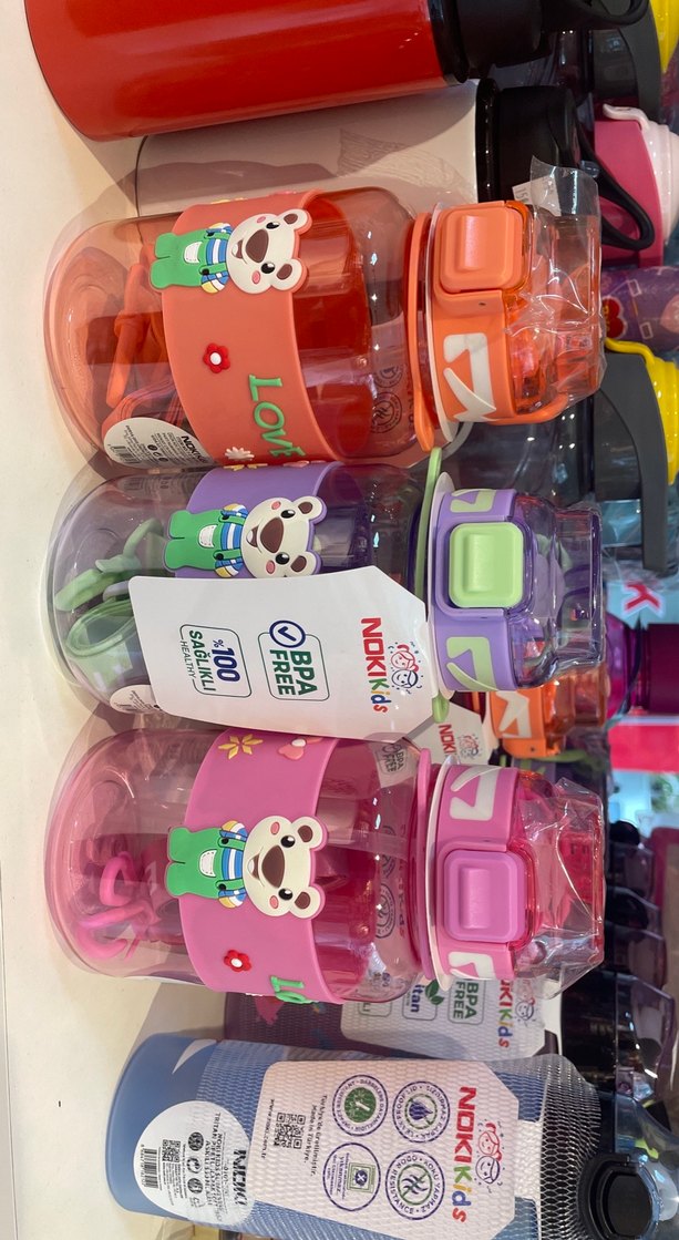 NOKIKds çocuk termos şişeleri, BPA içermeyen malzeme ve %100 sızdırmazlık özelliklerine sahiptir. Her şişede sevimli ayı figürü ve kolay açılır kapak bulunur.