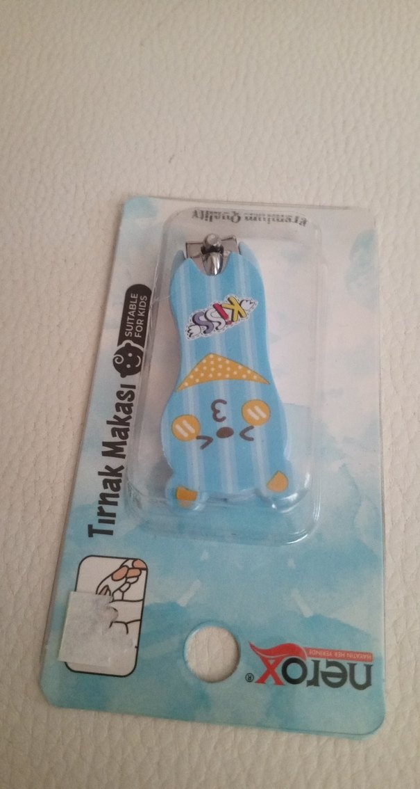 Çocuklar için uygun, renkli ve mavi tırnak makasıdır. Üzerinde sevimli yüz tasarımı vardır. ✂️
