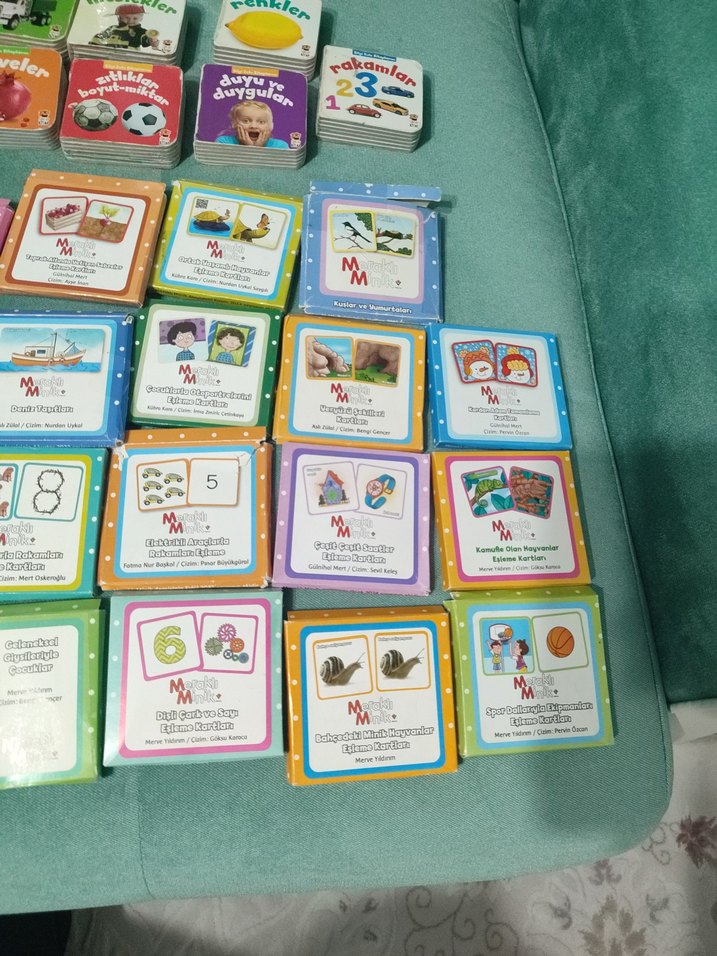Renkler, sayılar ve duyusal etkinliklerle dolu çocuklar için eğitici ve renkli kitap seti. kutuların içerisinin her birinden en az 10 tane kartlar çıkıyor eğitici çok güzel kartlar . en son fotoğrafta gösterdiğim gibi.