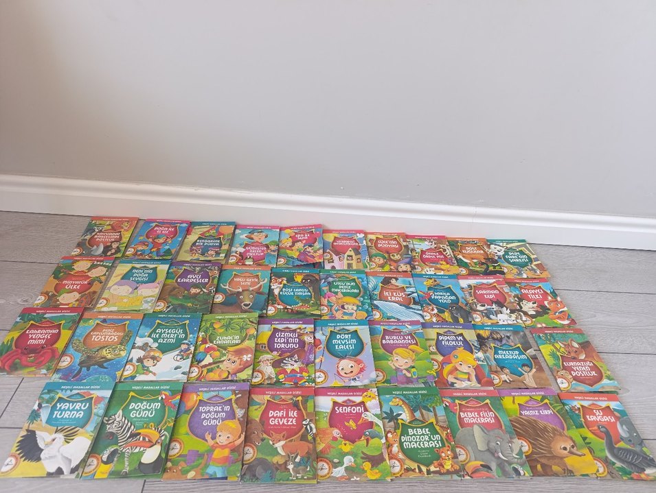 Çeşitli hikayeler ve karakterler içeren renkli ve eğlenceli çocuk kitapları seti. 39 adet