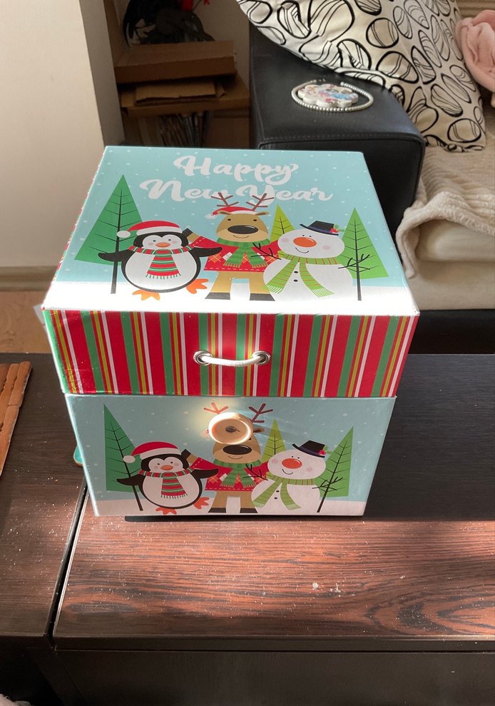 Çocuklar için yeni yıl temalı, renkli ve açık tonlarda tasarlanmış kutu. Penguen, geyik ve kardan adam figürleri bulunur, yan tarafları çizgili ve açma kulpludur.