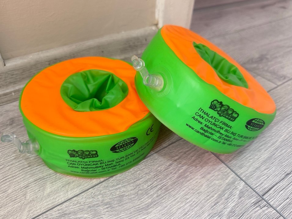 Çocuklar için renkli yeşil şişme kolluklar. Havuzda veya plajda kullanım için uygun, kolay şişirilir.