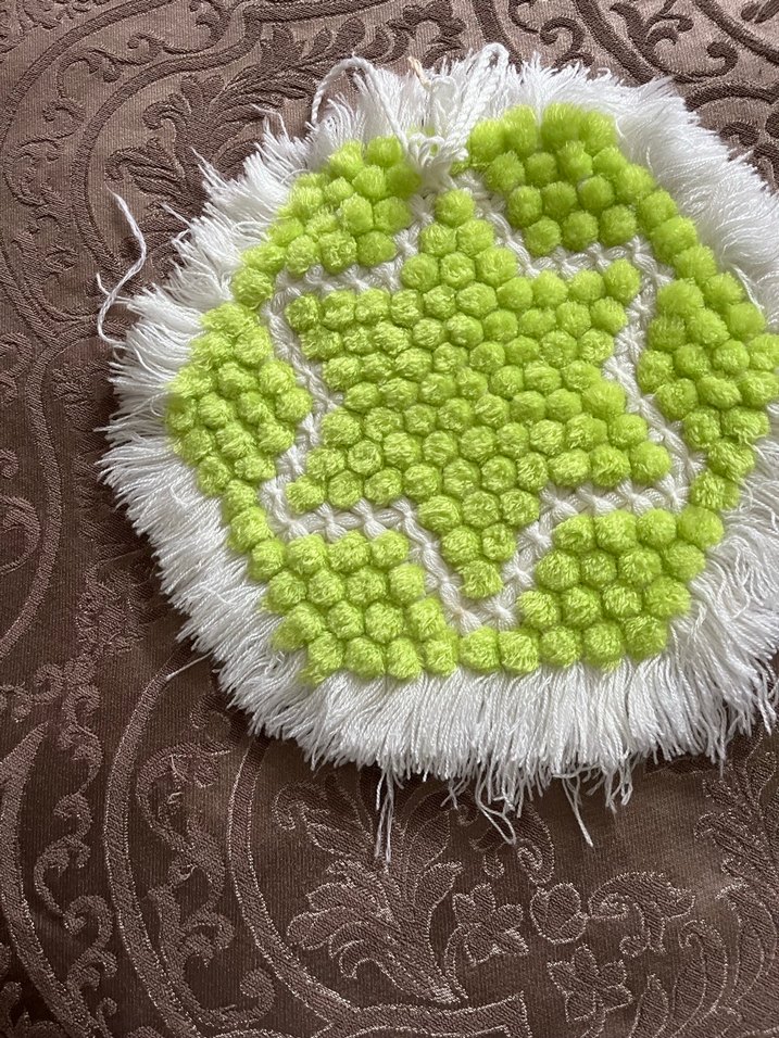 Renkli, yuvarlak çocuk halısı, yeşil yıldız deseni ve beyaz püsküllü kenarlarla yumuşak dokuda.