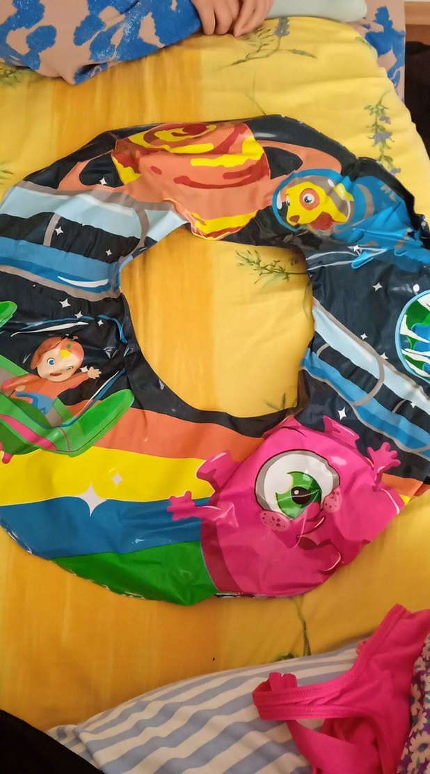 Renkli çizgi film karakterleriyle süslenmiş, çocuklar için yüzme simidi. ️