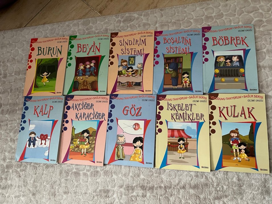 Beyin, sindirim, boşaltım, göz, iskelet ve karaciğer gibi vücut sistemlerini anlatan çocuklar için resimli sağlık kitapları serisi.
