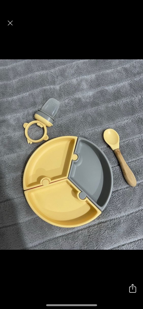 Çocuklar için sarı ve gri renklerde üç bölmeli tabak, ahşap saplı kaşık ve sarı diş kaşıyıcıdan oluşan set. 3 ay kullandik