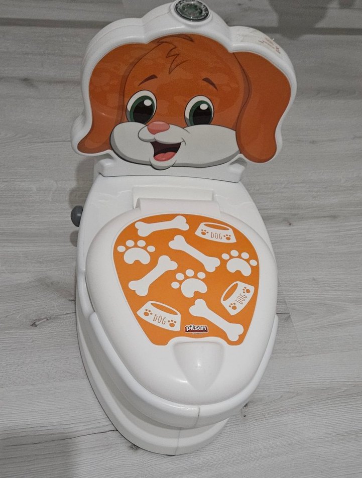 Sevimli köpek yüzü ve kemik desenleriyle çocuklar için konforlu ve kullanışlı lazımlık. Sıfırdan farksız sifon fonksiyonu calisir durumda