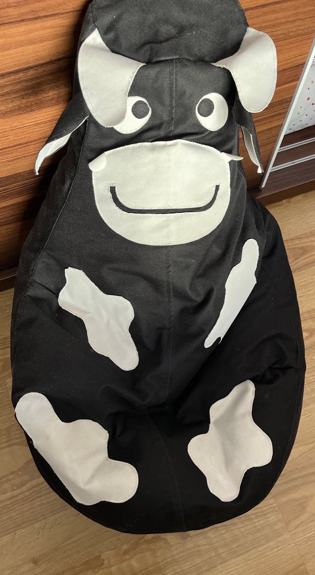 Yumuşak kumaştan, beyaz lekeli ve gülen yüzlü siyah inek desenli çocuk armut