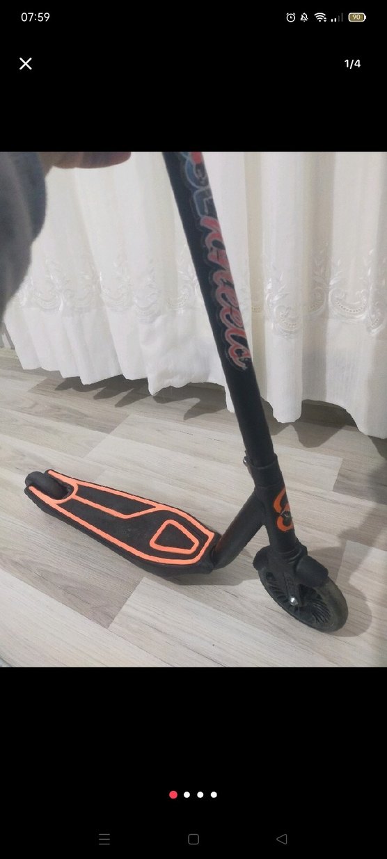 Çocuklar için siyah gövdeli, turuncu detaylı sağlam ve eğlenceli scooter.
